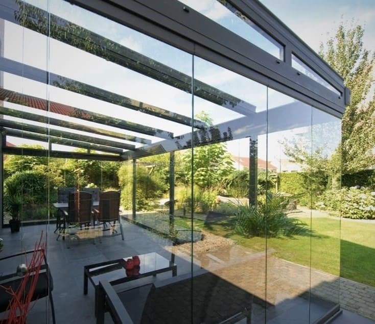 A arquitetura translúcida dos jardins inverno exteriores é representada com tetos fixos ou sistemas amovíveis e verticalmente delimitados por painéis vidro de correr e rebatíveis para assimilação de usabilidade espacial e visibilidade panorâmica.