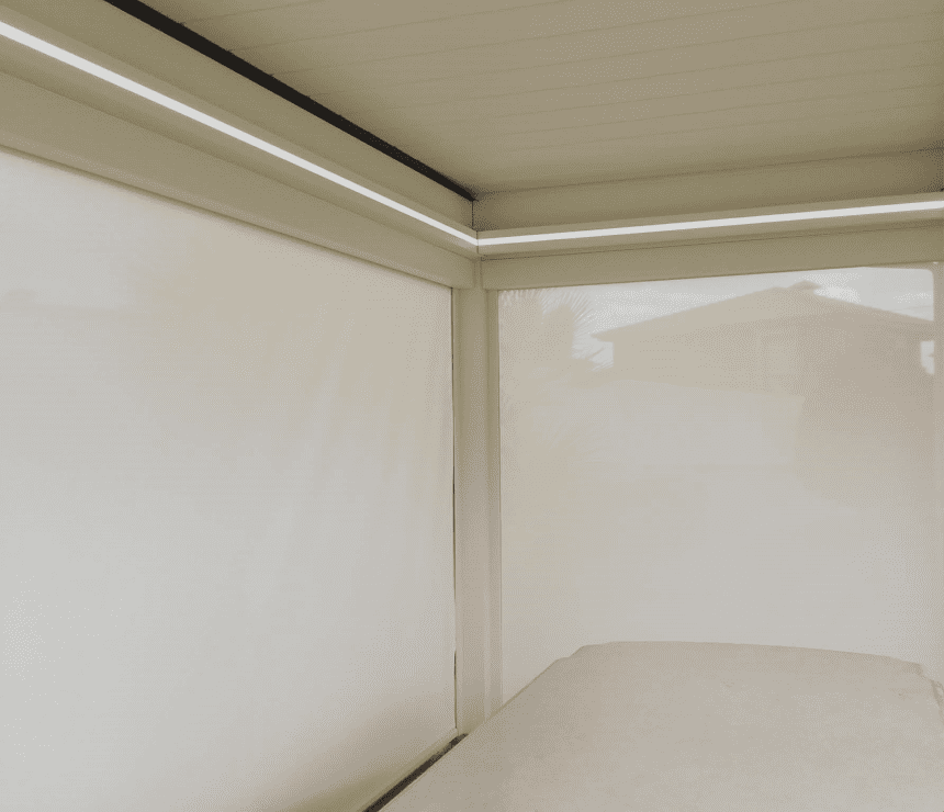 O funcionamento em guias laterais projeta toldo sombreador exterior motorizado com durabilidade e supreendente integridade estrutural até em condições atmosféricas severas.